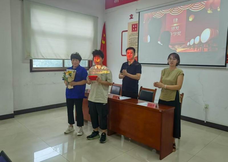 實業(yè)公司工會主席賈少緯、工會經(jīng)費審查委員會主任劉興明為職工子女頒獎。